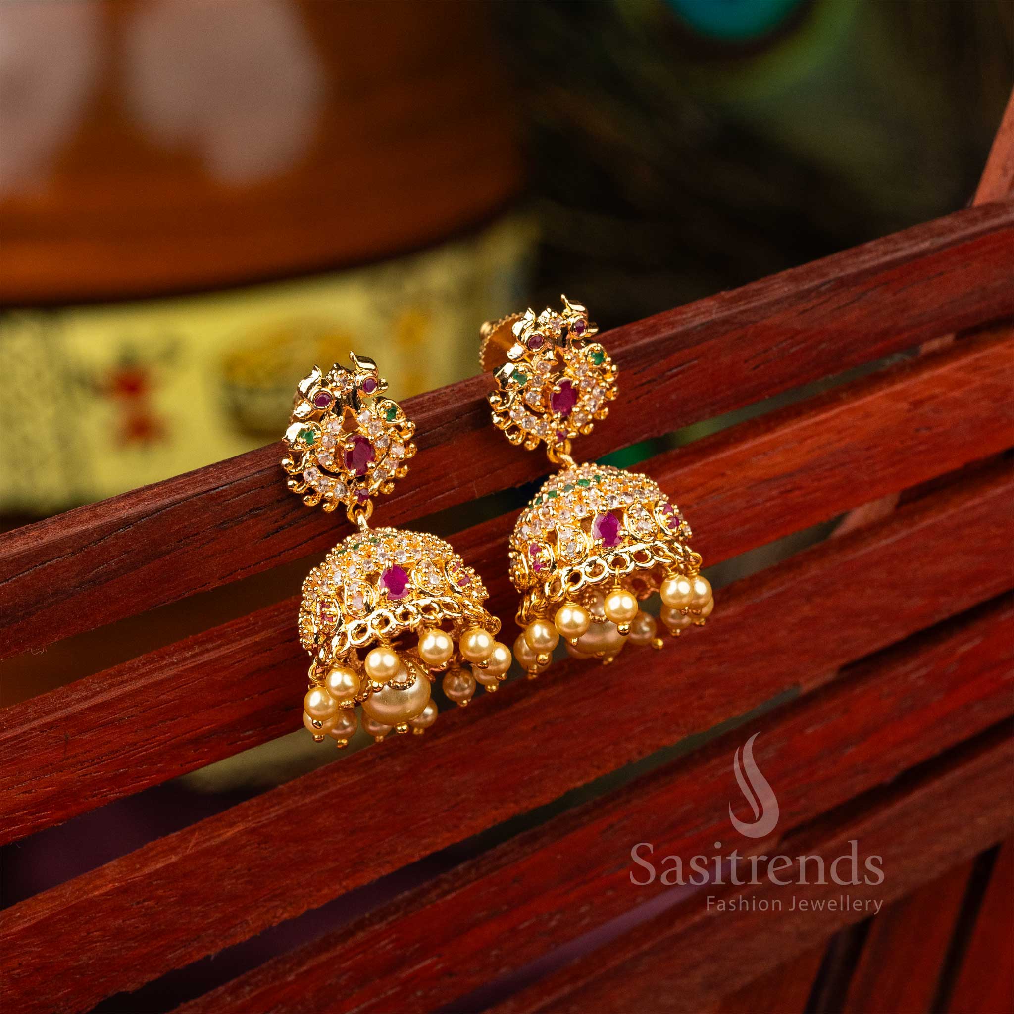 - Description: Enjoy classic style with our newest micro gold plated AD stone pearl jhumkas, which are painstakingly made from premium brass and embellished with fine embellishments. These gorgeous earrings have a gorgeous spherical design at the top and intricate peacock and flower motifs at the bottom, which are highlighted by tiny bead drops. They are chic and adaptable additions to your collection, ideal for lehengas, sarees, and other traditional attire. To ensure flawless quality and endurance, each piece is painstakingly plated with one gram of tiny gold using 24-carat pure gold. These jhumkas, which are covered by a six months guarantee on after-sales care, go beyond simple accessories to become treasured keepsakes, making them great presents for family members who value tradition. Be it traditional festivals, weddings, birthdays, or celebrations, make a statement with these stunning jhumkas that embody the essence of timeless tradition.