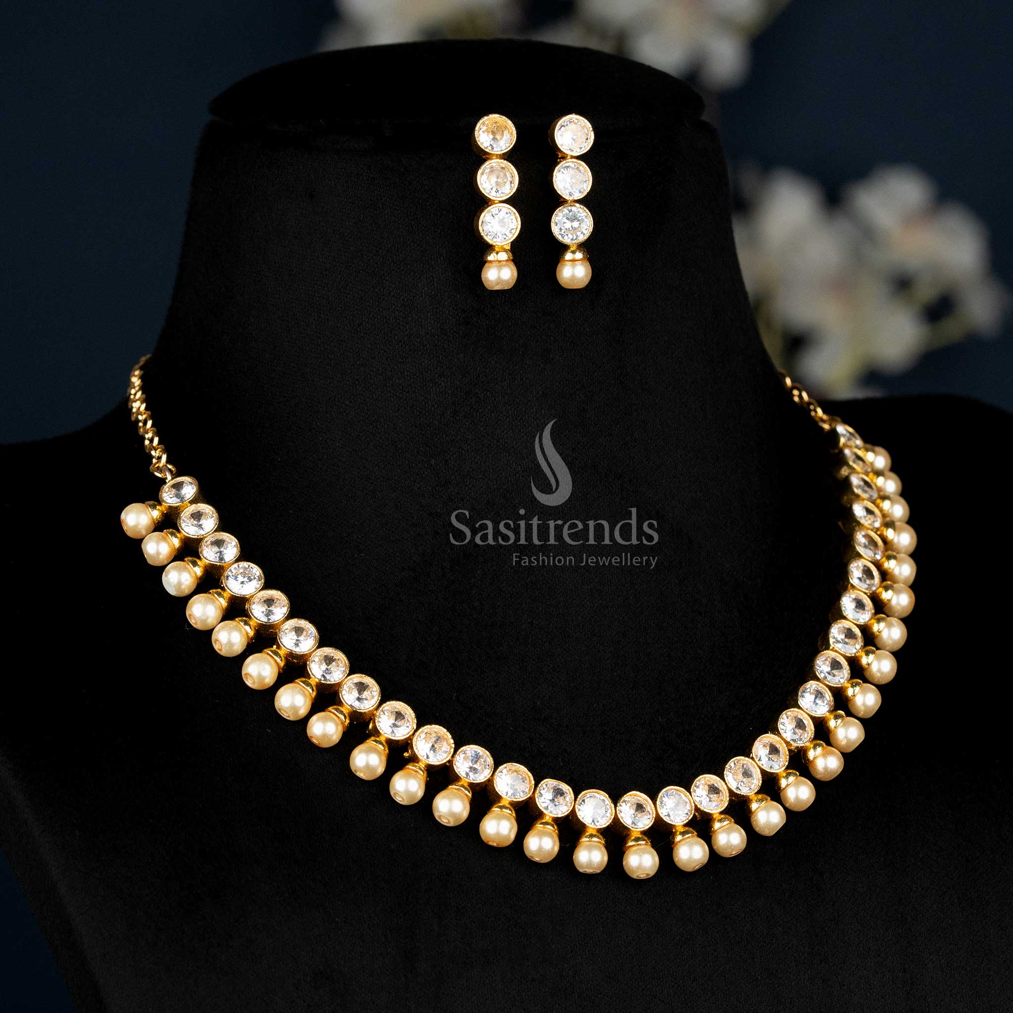American Diamond Stone Studded Look Pearl Drop Necklace Jewellery Set – Gold Plated Traditional Design - Sasitrends
