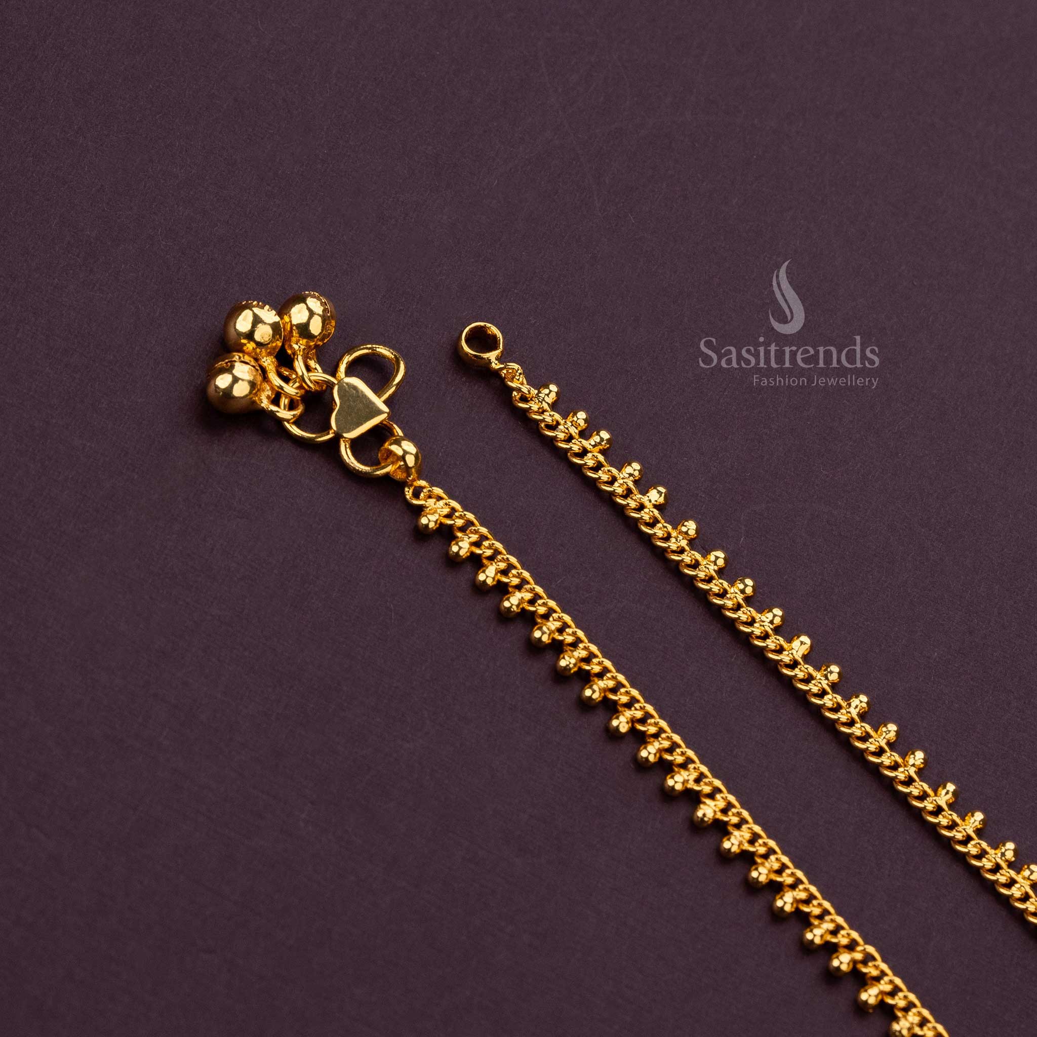 - Description:Â Embrace the perfect blend of tradition and elegance with our Traditional Guaranteed Micro Gold Plated Anklets. Featuring a stylish beads pattern and crafted with premium brass, these anklets are plated with 24-carat pure gold for a luxurious, real gold-like finish. Ideal for both casual and formal outfits, they offer sleek, all-day comfort without compromising on style. Perfect for special occasions like weddings, festivals, and traditional gatherings, these anklets come with a lifetime guarantee on the plating service, ensuring they maintain their beauty for years to come.