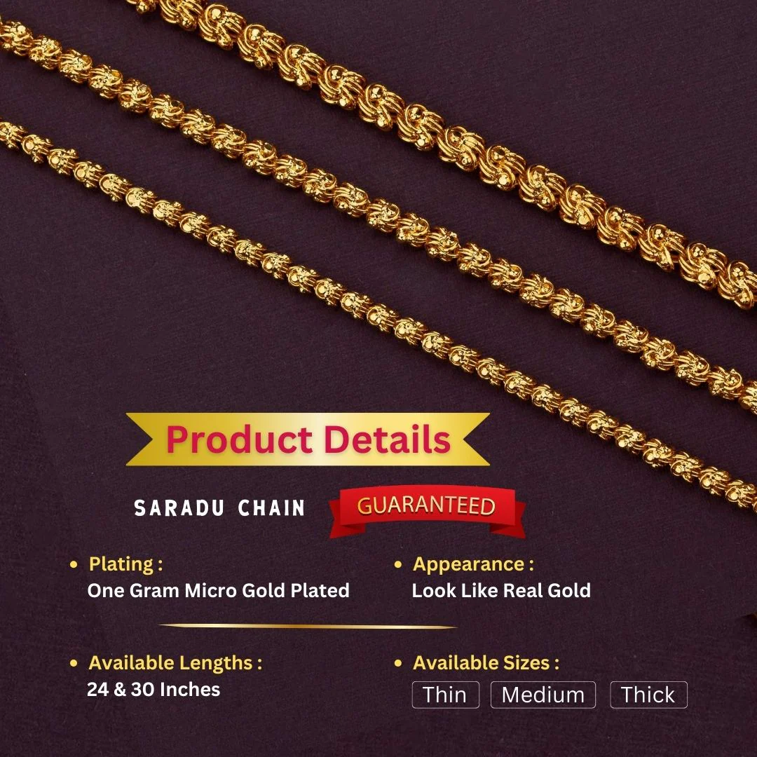 - Product Description: Elevate your traditional look with this exquisitely crafted Dasavatharam chain, made of premium brass and plated with 24-carat pure gold. Available in three thickness options (Thin, Medium, and Thick), this micro gold-plated saradu chain replicates the richness of real gold and comes with a lifetime guarantee. Whether it's for weddings, festivals, or traditional gatherings, this long, flexible chain is the perfect accessory to enhance your style. With guaranteed lifelong plating and support, this luxurious 1-gram chain promises both quality and elegance, making it a dependable alternative to conventional gold jewellery.