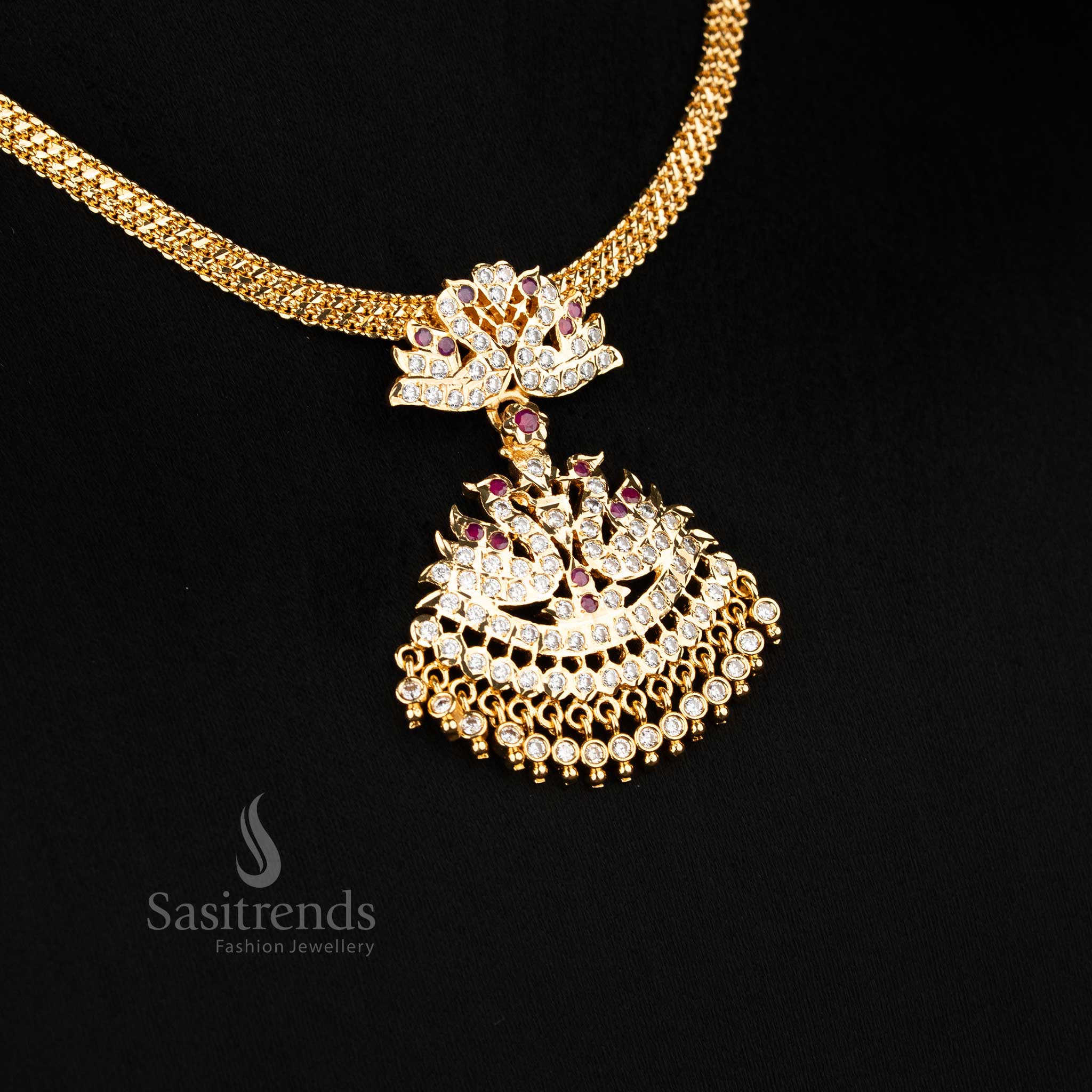 - Product Description: Add a touch of elegance and tradition to your attire with this exquisite Addigai Necklace. Crafted with attention to detail, the necklace features two small ducks facing each other, connected by a flexible chain on each side. Below the small ducks, a beautifully adorned pendant dangles, showcasing two big ducks facing each other. The pendant is embellished with traditional impon stones and delicate stone drops, adding a charming allure. Made of brass material and plated with micro gold, this necklace is perfect for traditional women who love to complement their attire, especially traditional sarees. It also makes an ideal gift for special occasions like a traditional Mother's anniversary.