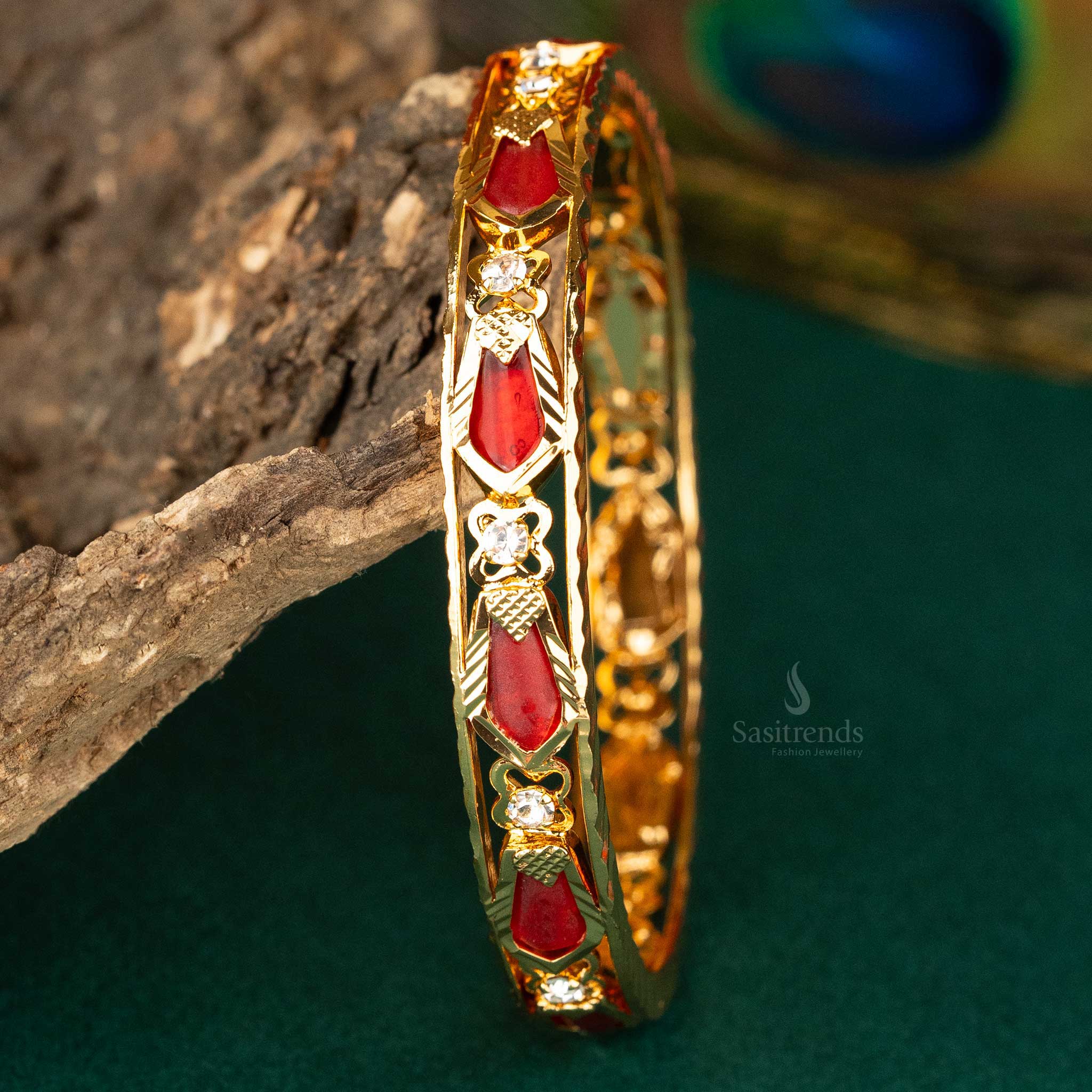 - Product Description: Elevate your traditional look with our stunning Kerala traditional wear micro gold plated nagapadam palakka bangle. Crafted from high-quality brass, this bangle is intricately designed with green nagapadam palakka petals and nagapadam petal-shaped green stones, plated with one-gram micro gold using 24-carat pure gold. Perfect for various occasions, including weddings, birthdays, and festivals like Onam and Navaratri. This bangle comes with a 1-year guarantee and after-sales service. Pair it effortlessly with your favorite traditional outfits for a timeless, elegant look.