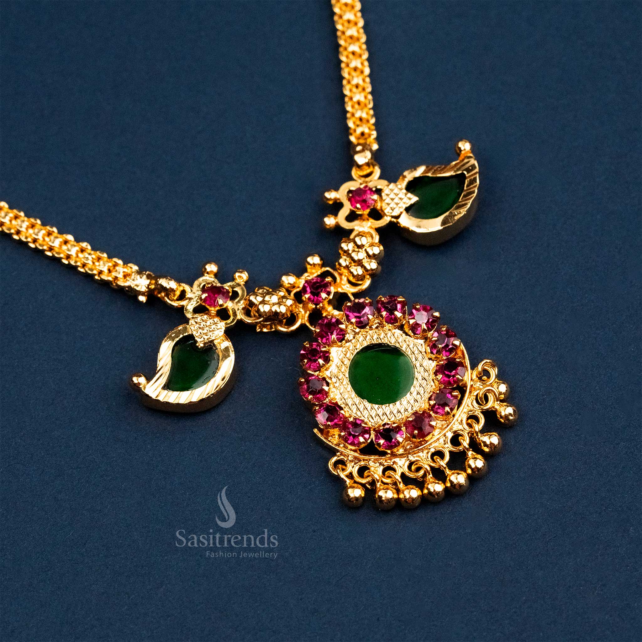 Micro Gold Plated Kerala Traditional Mango Leaf Palakka Necklace with Green Stone Pendant | Sasitrends