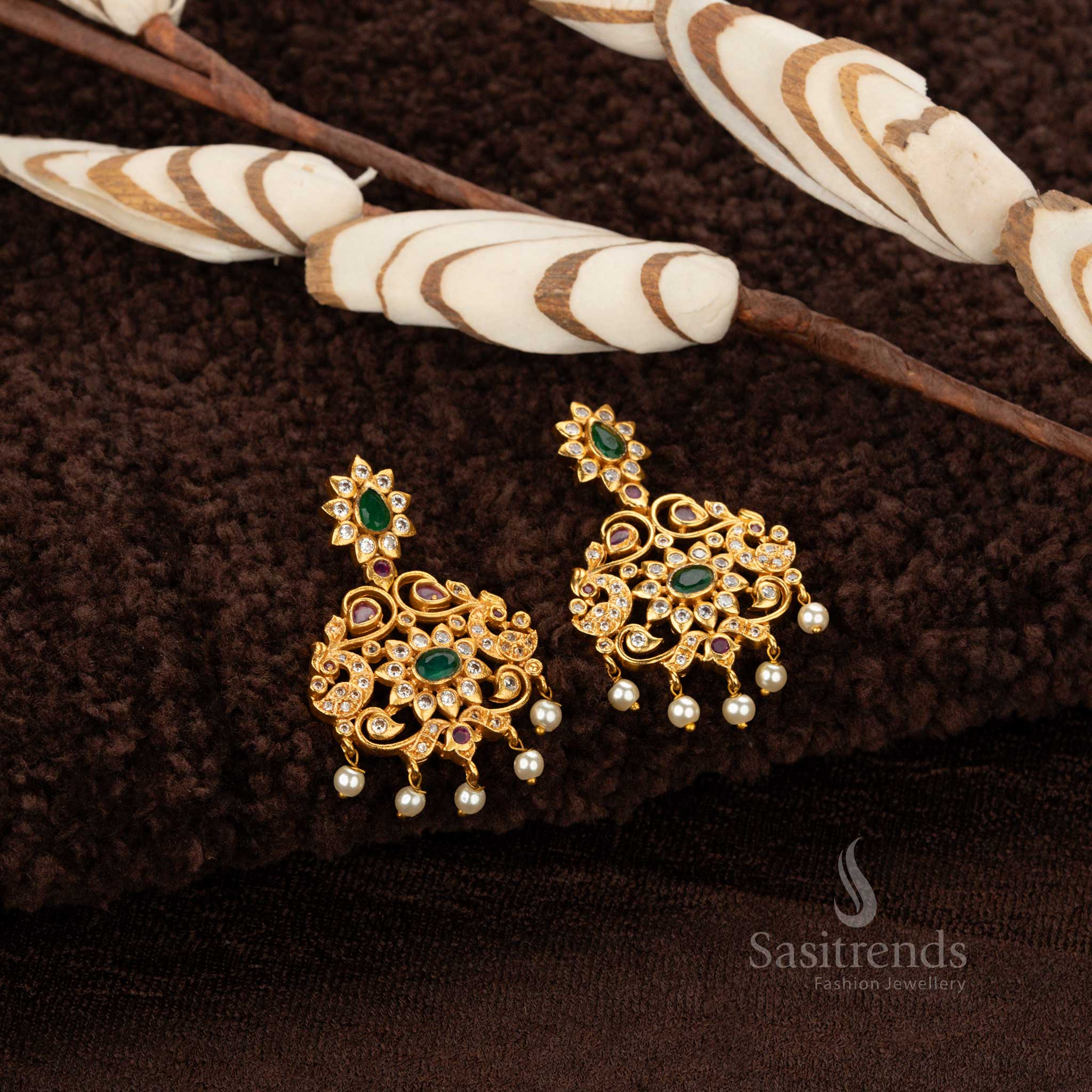 Trendy Temple Matte Gold Plated Floral Peacock Pendant American Diamond Long Necklace Jewellery Set for Women | Sasitrends