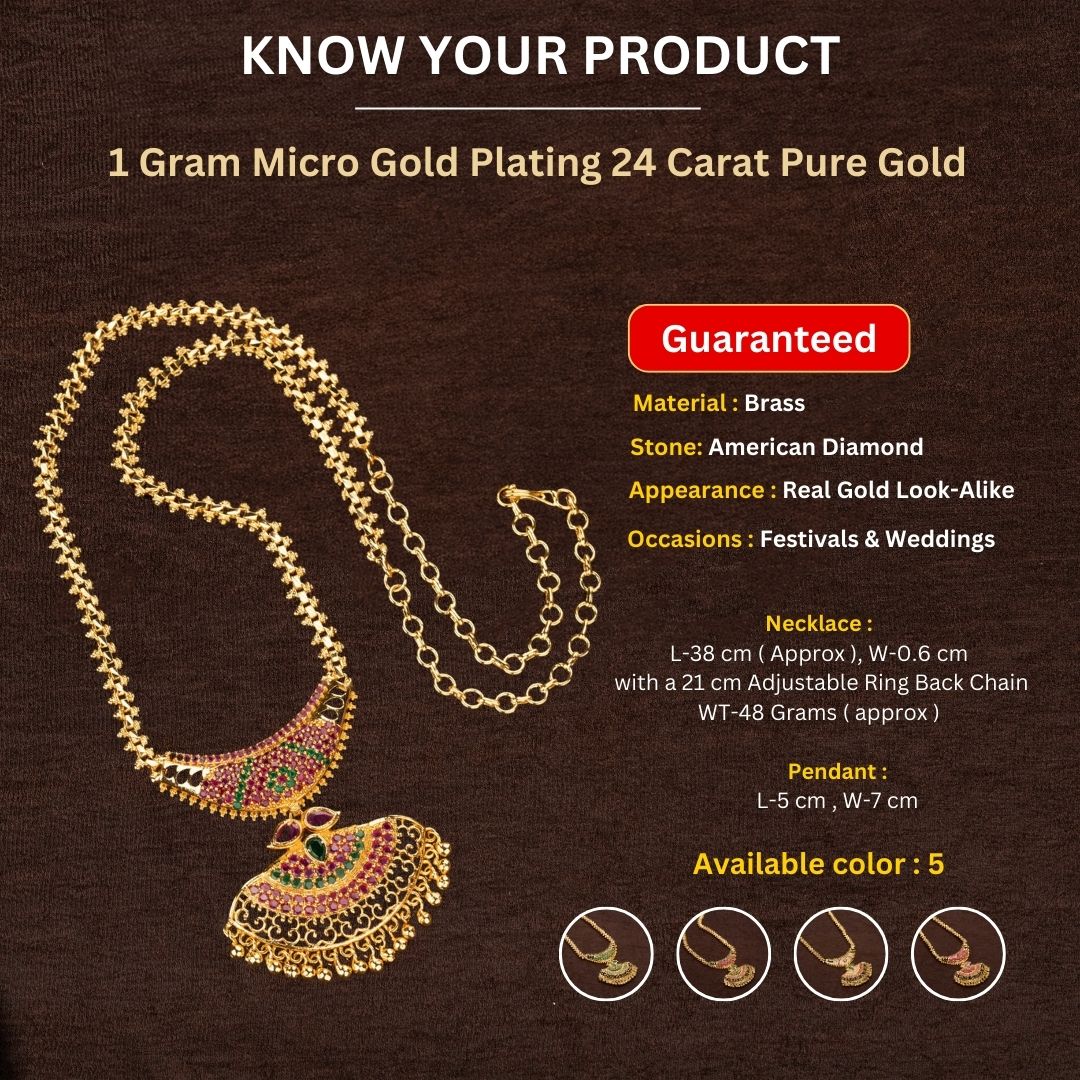 - Product Description: Elevate your ethnic elegance with our exquisite Traditional Micro Gold Plated Long Pendant Gajiri Chain Necklace. This intricately designed chain features gajiri on both sides and a double dollar pendant, lavishly adorned with glistening American diamond stones. At its base, golden beads add a touch of opulence. Crafted from high-quality brass material, this chain is meticulously plated with micro gold, using a gram of 24-carat pure gold. Its timeless design makes it the perfect accessory for a wide range of occasions, including parties, weddings, baby showers, and festive celebrations. Pair it with your favorite ethnic ensembles, whether it's rich sarees, half sarees, or any traditional attire, to instantly enhance your allure. Embrace tradition with a touch of modern flair when you wear our Traditional Micro Gold Plated Long Pendant Gajiri Chain for women. It's the latest trend in jewelry, and it's sure to make you shine at any event. Order yours today to add a touch of timeless beauty to your collection.