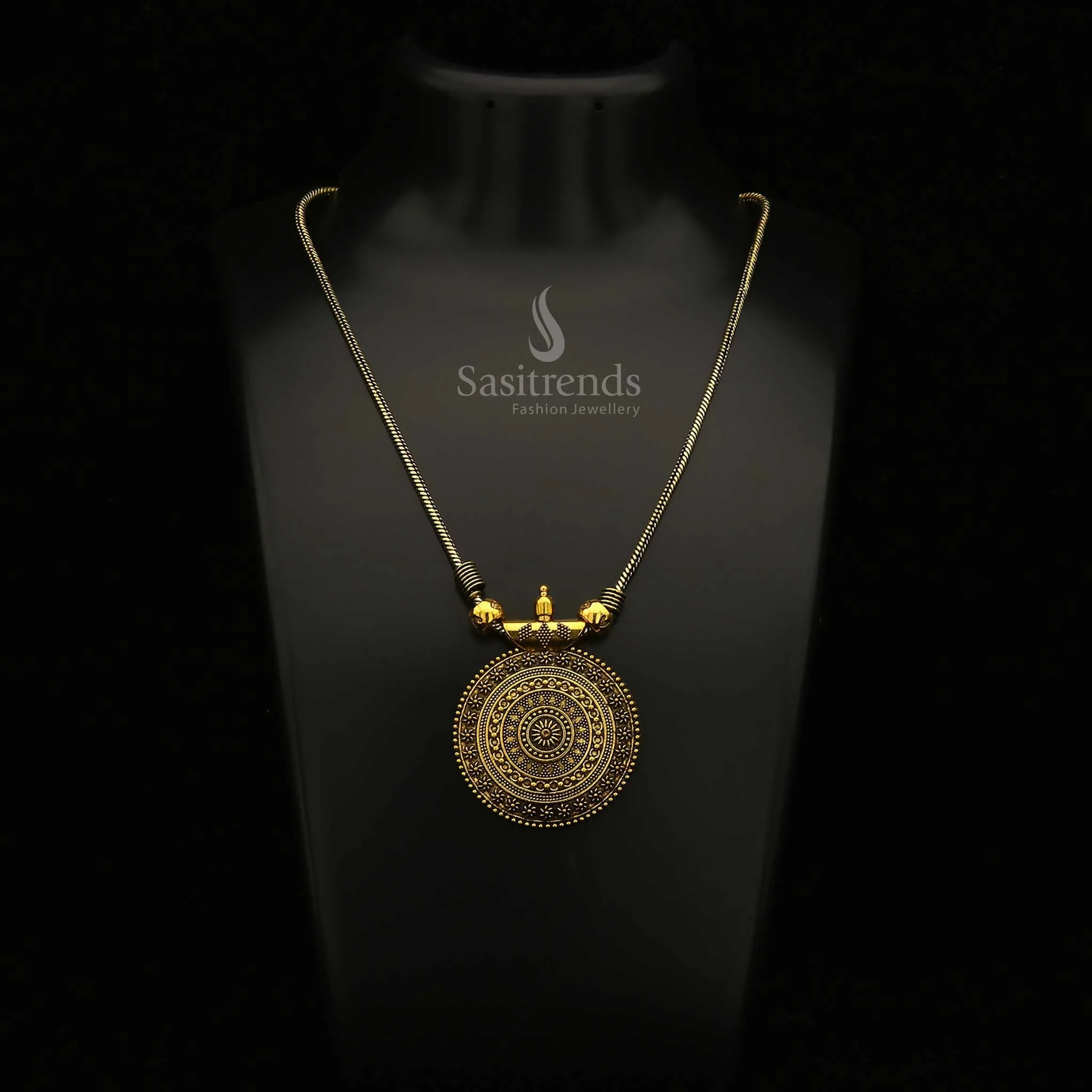 - Product Description: Discover understated beauty with the Roopasi Small Chakra Pendant Chain Necklace, a piece that speaks volumes with its discreet yet detailed craftsmanship. Designed for both subtlety and grace, the small pendant showcases the intricate chakra design that is a hallmark of cultural richness and artisanal heritage. The delicate pendant hangs from a sophisticated chain, available in both a deep oxidised silver and a radiant antique gold finish, providing versatility and timeless appeal. This necklace strikes the perfect balance between statement and simplicity, catering to those who appreciate elegance in small packages. Whether it's for a casual day out or a more formal event, this necklace is a versatile addition to any jewellery collection.